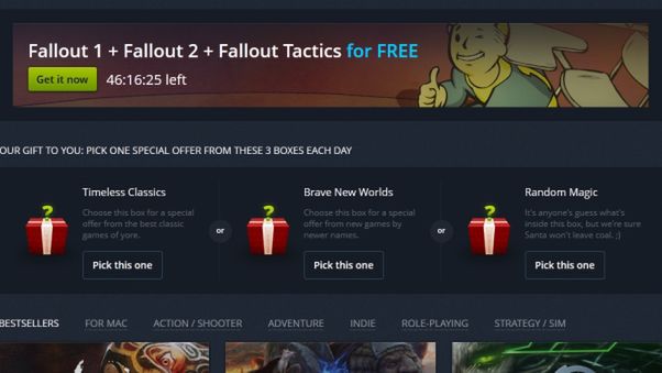 Największą atrakcją pierwszego dnia z pewnością są jednak trzy klasyczne gry: Fallout, Fallout 2 i Fallout Tactics. Można je bowiem dostać zupełnie za darmo. Wystarczy wejść tutaj, zalogować się i dodać je do swojej kolekcji (uwaga: serwery GOG-a przez chwilę nie wytrzymały oblężenia graczy. Bądźcie gotowi na ew. problemy z pobieraniem albo poczekajcie kilka godzin). Promocja potrwa jeszcze dwa dni.