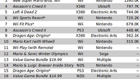 W zestawieniu pojawia się też Dragon Age w wersji na PS3 na miejscu 15 (6 oczek niżej niż Xboksowa wersja), wraca Halo 3: ODST i Borderlandsy na Xboksa 360. 17 miejsce dla God of War Collection na PS3 to wg analityków bardzo dobry znak dla God of War 3. No bo skoro remake sprzedaje się aż tak dobrze...
