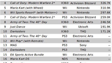 Na 17 miejscu Bayonetta w wersji na 360. Szkoda, myślałem, że lepiej pójdzie temu tytułowi. Pojawia się też trochę gier na PS3. Mamy MAGa na 13 miejscu i God of War Collection na 20. Skoro tak dobrze sprzedaje się odświeżona wersja poprzednich gier, to co się będzie działo przy premierze God of War 3? Darksiders w wersji na platformę Sony jest o 4 miejsca niżej niż na 360, zaś Army of Two: 40th Day na PS3 załapało się na miejsce 11.