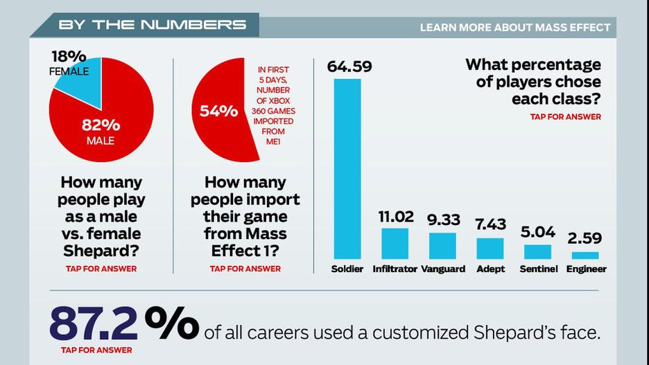 Powyższe statystyki pochodzą z aplikacji Final Hours pokazującej kulisy produkcji trzeciej części kosmicznej sagi BioWare. Możemy dzięki nim zobaczyć, że częściej gramy Shepardem niż Shepardzicą, naszą domyślną profesją jest żołnierz i lubimy sami tworzyć twarz naszej postaci za pomocą dostępnych narzędzi.