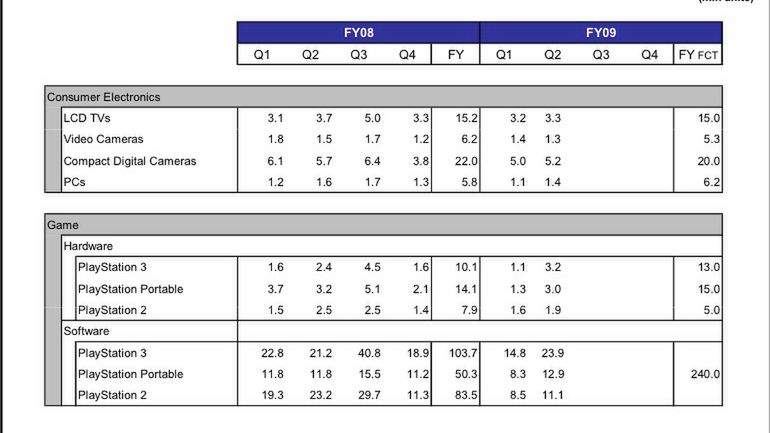 PS3 idzie w górę i drugi kwartał zakończyło z wynikiem 3,2 miliona sztuk. Sprzedaż zarówno PSP i PS2 spada, w Q2 było to odpowiednio 3 i 1,9 miliona sztuk.