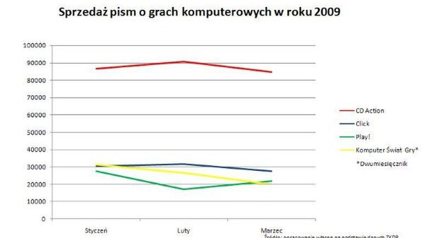 Hubert z Branży Gier przygotował kolejne zestawienie obejmujące sprzedaż polskich periodyków branżowych w marcu 2009 (poprzednie możecie znaleźć tutaj). Po raz ostatni widzimy w nim Clicka. CD-Action dalej trzyma się najlepiej ze sprzedażą na poziomie 85 tysięcy egzemplarzy (spadek 6000), zyskał nieco Play, stracił z kolei dwumiesięcznik Komputer Świat Gry. Ale, tak jak sugeruje Hubert, najciekawiej prezentować się będzie zestawienie za kolejny miesiąc - wtedy zobaczymy gdzie powędrowali czytelnicy Clicka.