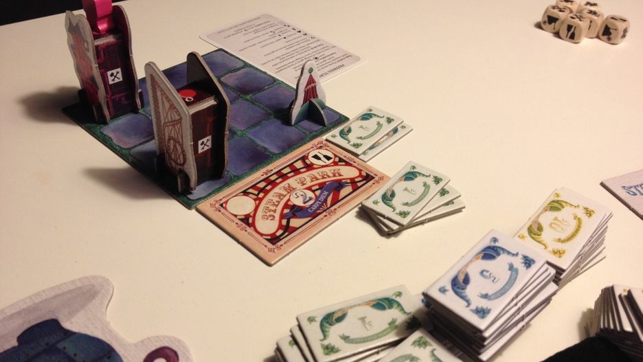 Steam Park. Trochę jak Theme Park, ale ta para jest ważna. Bo nasz park jest troszkę steampunkowy, z dziwacznymi kolejkami górskimi i innymi nietypowymi obiektami. Trochę w stylu Machinarium, a trochę w stylu planszówkowego Dixita - oba skojarzenia są słuszne, a drugie nawet bardziej, bo ilustracje robiła ta sama autorka, Marie Cardouat. Najważniejsze jednak, że Steam Park to bardzo przyjemna gra, nieszczególnie skomplikowana, za to zabawna i wciągająca.