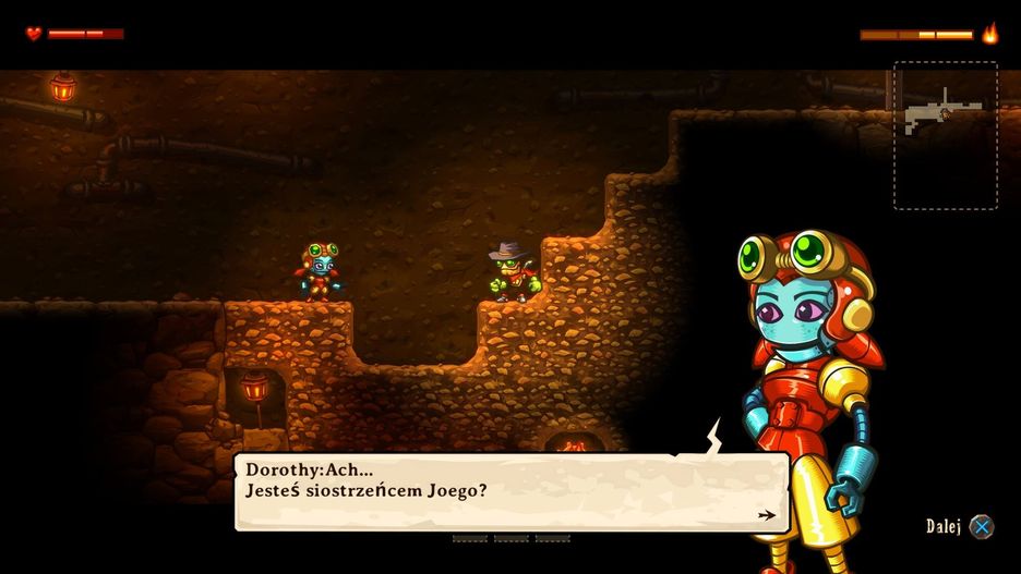 Mocną stroną gry jest właśnie to, że dobrze radzi sobie z monotonią górniczego życia. Regularnie dorzuca kolejne ulepszenia, które pozwalają zmierzyć się z pokojami wyzwań, które wcześniej były nie do ugryzienia. Podziemne otoczenie też zmienia się zaskakująco szybko. Przy żmudnej Terrari, SteamWorld Dig to prawdziwy ekspres ku głębinom, ale z porównywaniem tych gier lepiej się nie zapędzać. Terraria to olbrzymi, pełen sekretów świat, SteamWorld Dig to krótka przygoda, mocno popychająca gracza w kierunku kolejnych celów i nie pozwalająca się po drodze zgubić. Patrzenie jak Rusty rośnie w siłę sprawia frajdę, ale jego historia nie ma do zaoferowania wiele, jeśli idzie o eksplorację podziemnego świata.