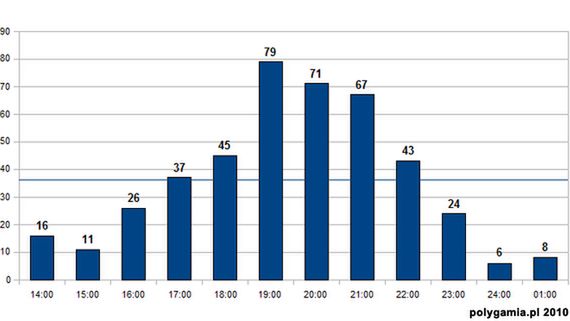 Za pośrednictwem sondy odpowiedziało na nią 433 osoby, z których większość wskazało godzinę 19:00. Podobnie jak w poważnych badaniach amerykańskiej firmy, także i w naszej sondzie wyszło, że "godziny największej grywalności" wypadają na godz. 19 - 21 - o tej porze gra 49 proc. wszystkich osób biorących udział w sondzie.