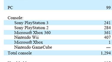 Jeżeli chodzi o same konsole, to na pierwszym miejscu mamy Wii, co jest w miarę oczywiste. Potem 360, PS2, PS3 i Xbox, któremu udało się zarobić milion dolarów dla firmy (bo te liczby to miliony, nie tysiące). GameCube niestety nie jest aż tak dziarskim staruszkiem jak inne platformy z jego generacji. Konsole przenośne zostały potraktowane hurtowo, więc nie wiemy jak się ma DS do PSP, choć możemy to oczywiście podejrzewać.