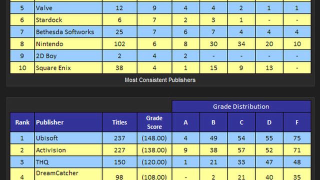 Listę najgorzej ocenianych otwiera Ubisoft z wynikiem -148. Warto jednak zwrócić uwagę, że winna temu jest masa chłamu (75 tytułów!), które firma wydała (och te wszystkie gry z Z w tytule...). Tylko 4 tytuły tego wydawcy załapały się na najwyższe noty. Tuż za nim znajdują się Activision (-138) i THQ (-120). Wyraźnie widać jak dużo słabych gier wydały te firmy i jak bardzo zaważyło to na ich ogólnej ocenie.
