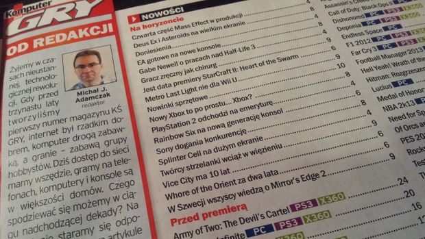 Wśród ciekawych materiałów z ostatniego numeru 1/2013 warto wymienić wywiad z rysownikiem, Michałem "Śledziem" Śledzińskim - o rysowaniu, ale i grach. Może nie wiecie, ale Śledziu jest maniakiem serii Monster Hunter. Ponadto rzuca się w oczy obszerny tekst z przewidywaniami na temat przyszłości gier.