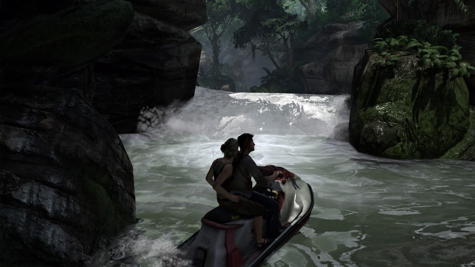 Widząc, że bohaterowie pakują się na skuter za pierwszym razem, liczyłem na etap pełen pędu, może na kilka spektakularnych wyskoków w powietrze, jakąś ucieczkę przed motorówkami przeciwnika. Zamiast tego dostałem najgorsze momenty gry. Nie możemy się rozpędzić, bo zaraz wpadamy na dryfujące wszędzie, wybuchające beczki. Wysadzimy beczki, to zaczynamy obrywać od przeciwników, którzy nagle stają się śmiertelnie groźnymi snajperami. Zatem etap opiera się na podpływaniu parę metrów, zatrzymywaniu się, strzelaniu do beczek i przeciwników z jak największej odległości i płynięciu dalej (Swoją drogą Elena przypieczętowuje w tym etapie swoją opinię zabójczej broni obsługując jedną ręką granatnik). Żeby tego było mało, drugie podejście do tego typu rozgrywki, odbywa się… na rzece! Płyniemy pod prąd, wspinając się na coraz większe kaskady, a z naprzeciwka płyną ku nam, jakże by inaczej, wybuchające beczki! Zatem teraz nie możemy się nawet zatrzymać, rozwalić co jest do rozwalenia i płynąć dalej! Każde zatrzymanie, to albo spadnięcie ze skalnego progu który przed chwilą pokonaliśmy, albo spotkanie z nadpływającą miną. Do tego wspinanie się po progach rzeki sprawia że skuter miota się od brzegu do brzegu obijając się o skały, a niekiedy wręcz obracając się o 180 stopni. Koszmar na wodzie. Gdyby etapy ze skuterami były zamienione kolejnością to zapewne rzuciłbym tę grę w diabły.
