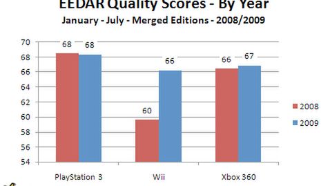 O ile jakość gier (liczona na podstawie uśrednionych wyników recenzji) na PS3 i Xboksie 360 prawie się nie zmieniła, o tyle badania EEDAR pokazują, że na Wii mamy poprawę. Pod uwagę wzięto pierwszą połowę 2008 i 2009 roku. Niby jest to tylko to 6%, ale jak to ładnie wygląda na wykresie!