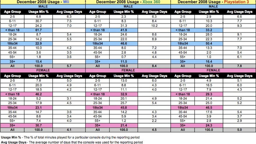 Kolejne badania, które przeprowadził Nielsen pokazują ile osoby danej płci i w danym przedziale wiekowym spędzają czasu przy Wii, PS3 i 360. Generalnie wnioski z badania są następujące - Wii to konsola dla najmłodszych, Xbox 360 dla młodzieży, starsi grają na PS3. Najrzadziej używana konsola to rzecz jasna sprzęt Nintendo, z kolei to na maszynie Microsoftu mężczyźni grają prawie dwa razy więcej od kobiet, podczas gdy na pozostałych jest bardziej wyrównane. Nieco dokładniejsze analizy z grudnia na obrazku powyżej, tutaj z ostatnich 3 miesięcy, zaś po więcej wniosków Nielsena odsyłamy do źródła.